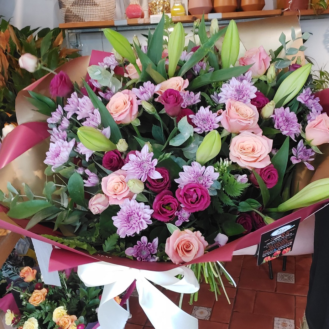 מגוון פרחים על גווני ורוד, בינהם ליזיאנטוס, שושן צחור , חרצית, עדעד ועוד. יתכנו שינויים בסוגי הפרחים בהתאם לטריות ולזמינות ותוך שמירה על אופי הזר.