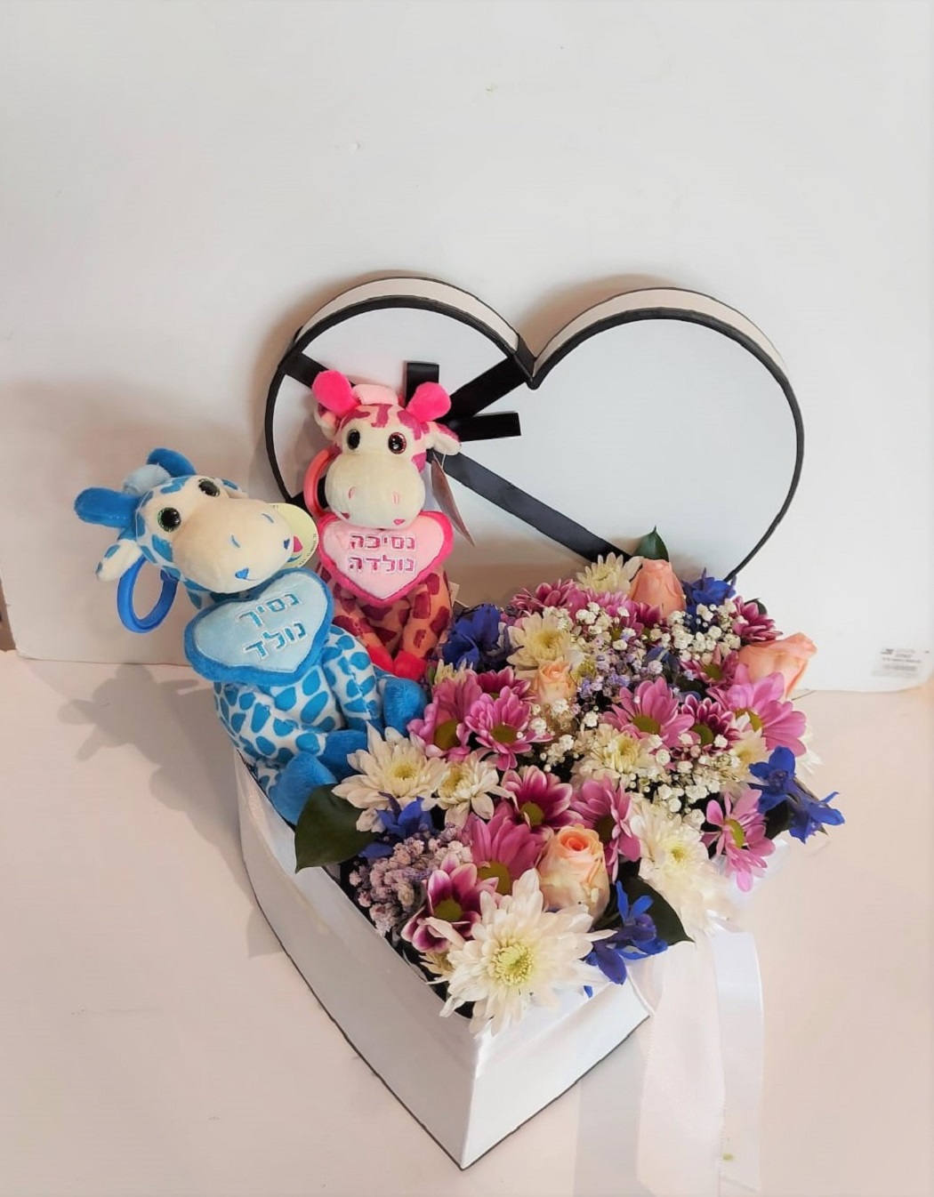 קופסא מהודרת מלאה פרחים ופרלינים בלגים הכוללת מובייל לעגלת התינוק. קיים לבן וגם לבת
